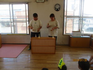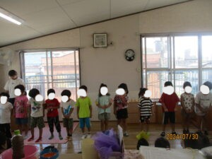 🎂7月のおたんじょうび会🎂 お知らせ 2024-07-31 7月のお誕生日月のお友だち、おめでとうございます🎉 おたんじょうび会はハンドベルでお祝いをしました! 「きらきら星」と「カエルのうた」を演奏しました♪ お水を入れたグラスでも音を奏でたり、 ほし組のみんなが歌を歌いました😊