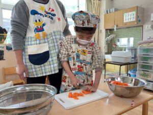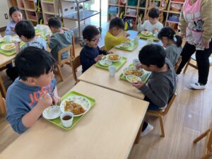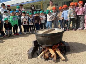 調理活動をして園庭でカレーを作りました。3.4.5歳は一緒に食べました