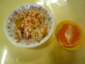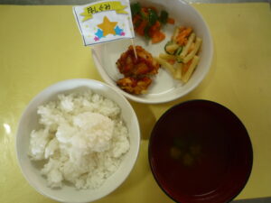 3月5日の給食 お知らせ 2026-03-05 (給食) ・ごはん ・ハンバーグ ・ピーマンのカレー炒め ・マカロニサラダ ・おくらとしめじのスープ (おやつ) ・ピラフ ・みかん ・お茶 ※今日はほし組のお別れ会だったので、ほし組に名前の書いた旗を立てました。