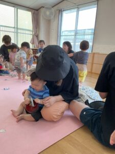 7月の園庭開放にお友だちが遊びに来てくれました。水遊びだったのですが気温が高すぎて出来なくなり、室内で1歳児と一緒に新聞遊びに変更しました。お家の人と一緒に新聞で遊んだり、保護者の方も園児とも一緒に新聞遊びをしたり、楽しく過ごしました。