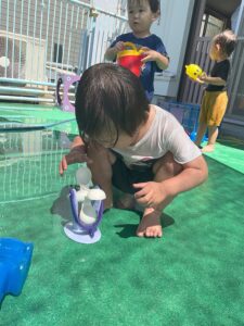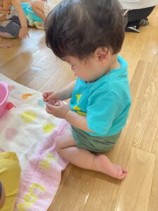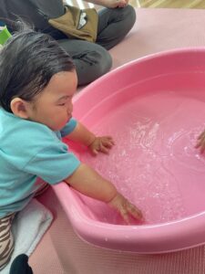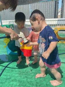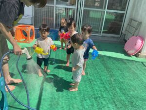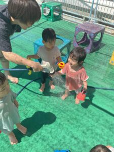 7月の様子 保育園の様子 2025-08-14 7月は乳児も水遊び⛲ 0歳児はお部屋で氷遊び。氷を触ったり、眺めたりしていました。1歳児はテラスに出ての水遊び。じょうろに水を入れてもらったり、シャワーがかかってもへっちゃら♪ 夏ならではの遊びを楽しみました