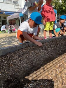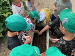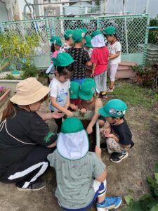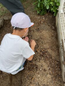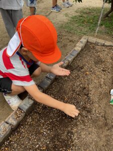 野菜の種を植えました 保育園の様子 2025-10-28 大根・人参・ほうれん草の種を植えました。「え~、大根の種ってこんなに小さいの~」子ども達は初めて見る種にビックリ! 大きくなるのを楽しみにしています。