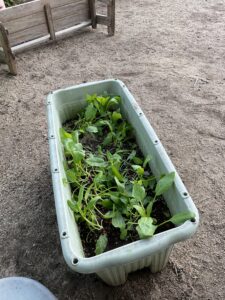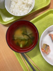 ほうれん草が育ってきて収穫しました。給食でお味噌汁の中に入れてもらい美味しく頂きました。