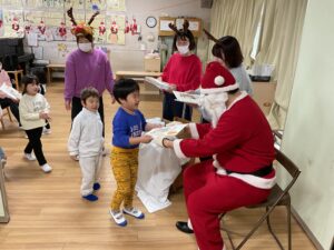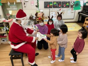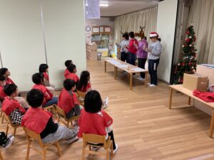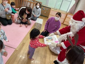 クリスマス会 保育園の様子 2025-12-25 12/24クリスマス会を開催しました。各クラスそれぞれにサンタさんが来てくれました。 トナカイさんのハンドベルの演奏を聴いたりプレゼントをもらったり楽しい時間を過ごしました。