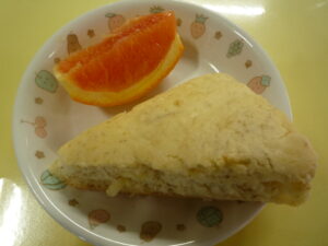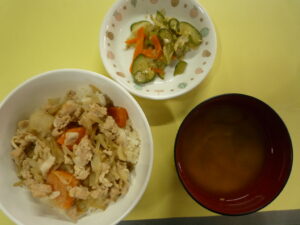 (給食) ・豚丼 ・ごまサラダ ・しめじと玉ねぎのみそ汁 (おやつ)・バナナケーキ ・オレンジ ・牛乳