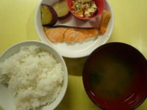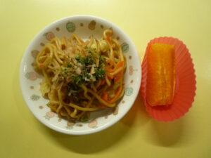 (給食) ・ごはん ・しゃけの柚子焼き ・ほうれん草の白和え ・さつまいもの甘露煮 ・もやしとわかめのみそ汁 (おやつ) ・焼きそば ・オレンジ ・お茶