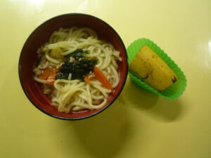 (給食) ・ごはん ・鶏の甘酢炒め ・さつまいもの天ぷら ・いんげん胡麻和え ・豆腐とねぎのすまし汁 (おやつ) ・おやつラーメン ・バナナ ・牛乳