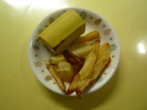 (給食) ・ごはん ・しゃけの柚子焼き ・湯豆腐 ・白菜ののり和え ・もやしと大根のみそ汁 (おやつ) ・スパイシーポテト ・バナナ ・牛乳