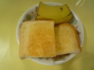 (ごはん) ・ごはん ・チャプチェ ・中華風サラダ ・チンゲン菜ともやしのスープ (おやつ) ・きなこトースト ・バナナ ・牛乳