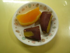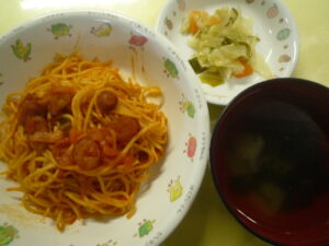 (給食) ・ナポリタンスパゲティー ・野菜サラダ ・玉ねぎとわかめのスープ (おやつ) ・蒸かし芋 ・オレンジ ・牛乳