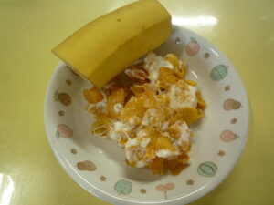 3月7日の給食 給食 2025-03-07 (給食) ・しょうゆラーメン ・大根ナムル (おやつ)・コーンフレークおこし ・バナナ ・牛乳 ☆お隣の畑からたくさん大根をいただいたので、もやしナムルを大根のナムルに変更しました。