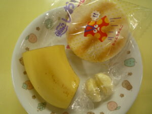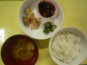 5月26日の給食 給食 2025-05-26 (給食) ・ごはん ・鶏の照り焼き ・ひじきの煮つけ ・きゅうりのゆかり和え ・きゃべつとえのきのすまし汁 (おやつ)・チーズ ・塩せんべい ・バナナ ・牛乳 ※キャンディーチーズは誤嚥防止の為、幼児は半分、乳児は四分の一にカットしました。