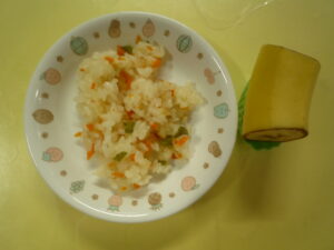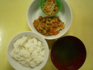 (給食) ・ごはん ・マーボー豆腐 ・春雨サラダ ・しめじとわかめの中華スープ (おやつ) ・ピラフ ・バナナ ・お茶
