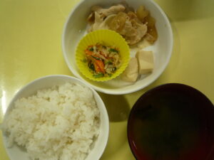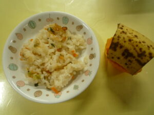(給食) ・ごはん ・豚のしょうが焼き ・高野豆腐の煮つけ ・小松菜ごま和え ・えのきとわかめのみそ汁 (おやつ)・チャーハン ・バナナ ・お茶