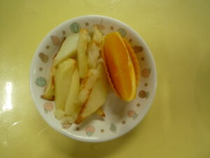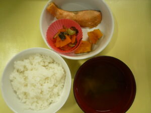 6月10日の給食 給食 2025-06-10 (給食) ・ごはん ・鮭のみそ焼き ・にんじんときゅうりの酢の物 ・かぼちゃ煮付け ・大根となめこのすまし汁 (おやつ) ・フライドポテト ・オレンジ ・牛乳
