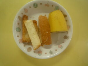 (給食) ・きつねうどん ・野菜サラダ (おやつ) ・ラスク ・バナナ ・牛乳