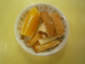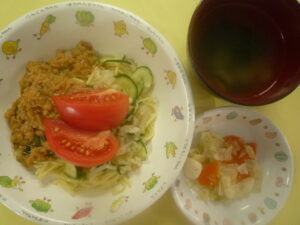 (給食) ・ジャージャー麵 ・中華風サラダ ・わかめと玉ねぎの中華スープ (おやつ) ・ラスク ・オレンジ ・牛乳
