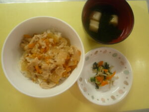 (給食) ・豚丼 ・小松菜のお浸し ・わかめと麩のすまし汁 (おやつ) ・チーズ ・ビスケット ・バナナ ・牛乳