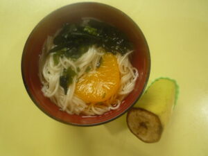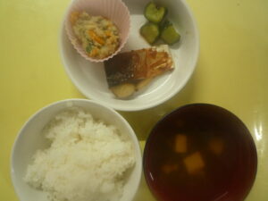 (給食) ・ごはん ・さばの梅焼き ・卯の花炒り煮 ・きゅうりの昆布和え ・豆腐となめこのすまし汁 (おやつ) ・そうめん ・バナナ ・お茶