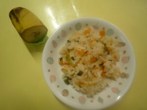 (給食) ・ごはん ・ポークケチャップ ・いんげんソテー ・コーンスープ (おやつ)・チャーハン ・バナナ ・お茶