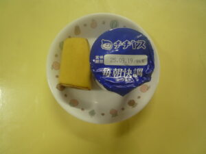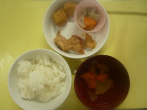 (給食) ・ごはん ・鶏の照り焼き ・がんも煮つけ ・キャベツのゆかり和え ・大根と人参のすまし汁 (おやつ) ・ヨーグルト ・バナナ ・牛乳