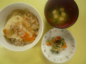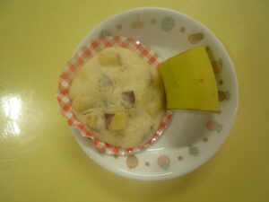 (給食) ・和風あんかけ丼 ・小松菜のお浸し ・豆腐とねぎのみそ汁 (おやつ) ・さつまいも蒸しパン ・バナナ ・牛乳