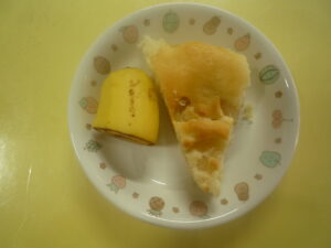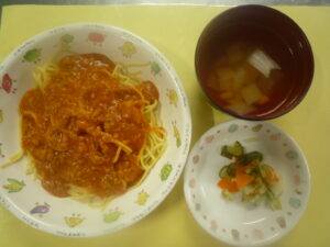 (給食) ・ミートソーススパゲティー ・野菜サラダ ・コンソメスープ (おやつ) ・りんごケーキ ・バナナ ・牛乳