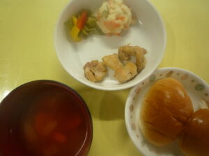 (給食) ・ロールパン ・タンドリーチキン ・ポテトサラダ ・ピーマンのマリネ ・トマトスープ ・牛乳 (おやつ) ・昆布おにぎり ・オレンジ ・お茶