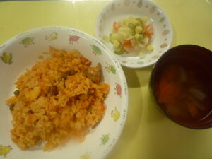(給食) ・卵入りチキンライス ・チーズサラダ ・オニオンスープ
