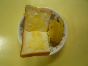 (給食) ・カレーライス ・野菜サラダ (おやつ) ・チーズトースト ・バナナ ・牛乳