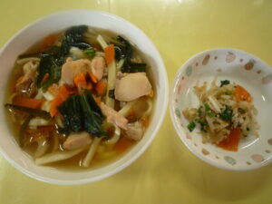 (給食) ・五目うどん ・ほうれん草のごま和え
