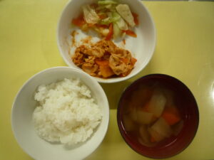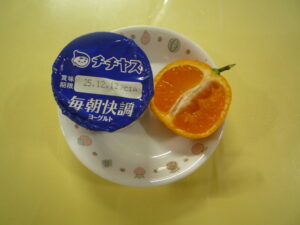 (給食) ・ごはん ・ポークケチャップ ・カリフラワーサラダ ・オニオンスープ (おやつ) ・ヨーグルト ・みかん ・牛乳