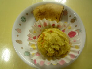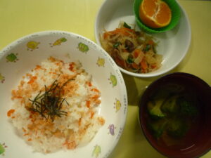 (給食) ・鮭ちらし寿司 ・チャプチェ ・みかん ・ブロッコリーとえのきのすまし汁 (おやつ) ・スイートポテト ・バナナ ・牛乳