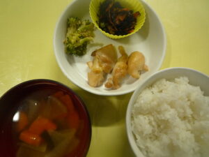 (給食) ・ごはん ・鶏の照り焼き ・ぶろっこりーのごま酢和え ・ひじきの炒り煮