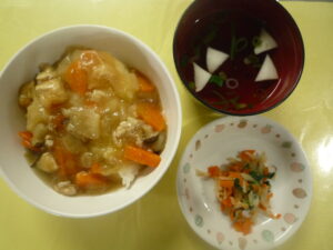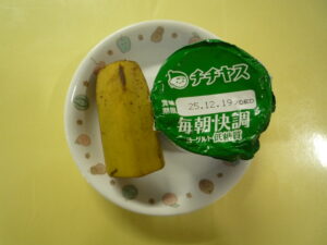 (給食) ・和風あんかけ丼 ・小松菜のお浸し ・大根とねぎのすまし汁 (おやつ) ・ヨーグルト ・バナナ ・牛乳