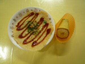 (給食) ・ごはん ・筑前煮 ・ほうれん草のごま和え ・しめじと豆腐のみそ汁 (おやつ) ・お好み焼き ・バナナ ・牛乳