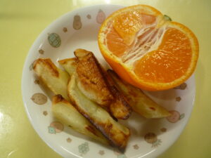 (給食) ・親子丼 ・白菜のお浸し ・あげとわかめのみそ汁 (おやつ)・スパイシーポテト ・みかん ・牛乳