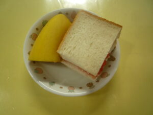 (給食) ・ごはん ・酢豚 ・焼きれんこん ・チンゲン菜と豆腐のスープ (おやつ) ・いちごジャムパン ・バナナ ・牛乳