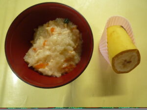 (給食) ・豚カレーうどん ・きゅうりともやしの酢の物 (おやつ)・中華がゆ ・バナナ ・お茶