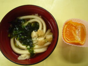 (給食) ・ごはん ・さばの塩焼き ・がんも煮つけ ・人参とちくわのきんぴら ・えのきとわかめのみそ汁 (おやつ)・きつねうどん ・みかん ・お茶