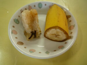 (給食) ・ごはん ・鶏の照り焼き ・カニカマともやしの酢の物 ・さつまいもと玉ねぎのみそ汁 (おやつ) ・昆布おにぎり ・バナナ ・お茶