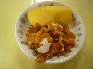 (給食) ・わかめごはん ・肉じゃが ・ほうれん草のごま和え ・大根とねぎのすまし汁 (おやつ) ・コーンフレークおこし ・バナナ ・牛乳