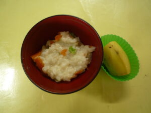 (給食) ・梅ごはん ・焼ししゃも ・小松菜ごま和え ・人参しりしり ・キャベツとじゃがいものみそ汁 (おやつ) ・中華がゆ ・バナナ ・お茶