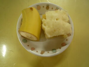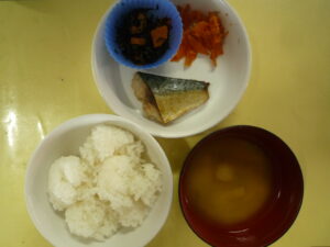 (給食) ・ごはん ・さばのカレー焼き ・人参のおかか和え ・ひじき煮つけ ・おくらと油揚げのみそ汁 (おやつ) ・さつまいも蒸しパン ・バナナ ・牛乳