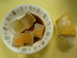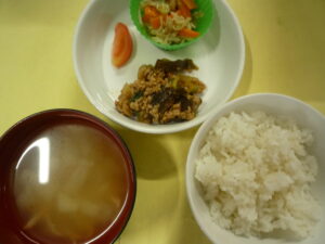 (給食) ・ごはん ・マーボーナス ・もやしナムル ・園庭のトマト ・カニカマとたまねぎのスープ (おやつ) ・わらび餅風 ・バナナ ・牛乳