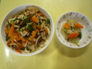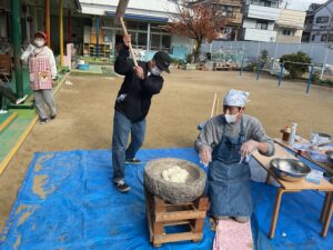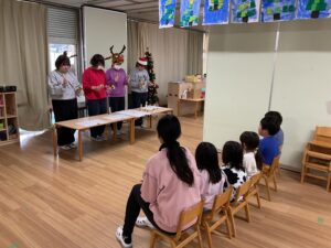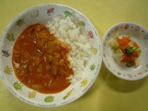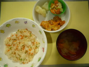 給食 2026-01-07 1月7日の給食 (給食) ・ごはん ・肉じゃが ・白菜のお浸し ・ねぎとえのきのすまし汁 (おやつ) ・七草がゆ ・バナナ ・お茶 続きを読むarrow_right 給食 2026-01-06 1月6日の給食 (給食) ・ハヤシライス ・野菜サラダ (おやつ)・チーズトースト ・みかん ・牛乳 ☆野菜サラダに園庭で採れたブロ 続きを読むarrow_right 給食 2026-01-05 1月5日の給食 (給食) ・鶏そぼろあんかけ丼 ・ひじき煮つけ ・麩とわかめのみそ汁 (おやつ) ・いちごジャム蒸しパン ・バナナ 続きを読むarrow_right 給食 2025-12-27 12月27日の給食 (給食) ・かやくうどん ・小松菜のお浸し (おやつ)・フライドポテト ・みかん 続きを読むarrow_right 給食 2025-12-26 12月26日の給食 (給食) ・冬野菜カレー ・マカロニサラダ (おやつ)・ホットケーキ ・みかん ・牛乳 ※本日のおやつを、梅おにぎり 続きを読むarrow_right 給食 2025-12-25 12月25日の給食 (給食) ・ごはん ・豚のしょうが焼き ・大根の梅肉和え ・ピーマンのカレー炒め ・白菜とあげのみそ汁 ※お 続きを読むarrow_right お知らせ 2025-12-25 おはなしたまてばこ 0.1歳児は東住吉区の図書館の方に絵本を読んでもらいました。 続きを読むarrow_right お知らせ 2025-12-25 餅つき 12/11餅つきをしました。子どもたちも「よいしょ~よいしょ~」と掛け声をして、 職員と保護者の方にもお手伝いをして 続きを読むarrow_right 保育園の様子 2025-12-25 クリスマス会 12/24クリスマス会を開催しました。各クラスそれぞれにサンタさんが来てくれました。 トナカイさんのハンドベルの演奏 続きを読むarrow_right お知らせ 2025-12-24 12月24日の給食 (給食) ・ピラフ ・鶏のトマトチーズ焼き ・フレンチサラダ ・こふきいも ・コンソメスープ (おやつ)・コ 続きを読むarrow_right